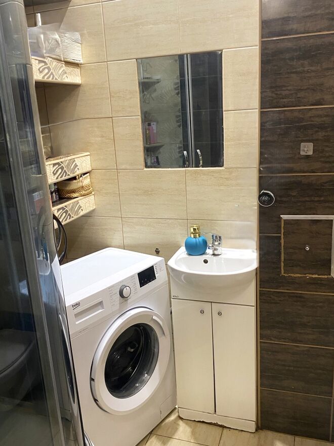 3) Łazienka z WC o powierzchni 2,80m2 w płytkach . Na wyposażeniu prysznic oraz pralka